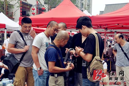 “和田玉吊坠,挂绳为小叶紫檀,虽然物件是现代的,但是小叶紫檀与和田玉的搭配充满了古朴的味道,起价4500元,现在开始竞价。”拍卖刚刚开始,现场便十分火热,周边陈列的展示柜也吸引了不少藏家的眼球,柜中陈列的珠宝、首饰、工艺品琳琅满目,官窑瓷器、翡翠玉石、各类彩宝争相斗艳,翡翠或以阳绿取胜或以水种迷人;白玉以雕工乱眼,或以玉质夺目,吸引了众多古玩爱好者。古玩街区与道路两旁也摆满了古玩字画工艺品,为竞买会增添异彩。